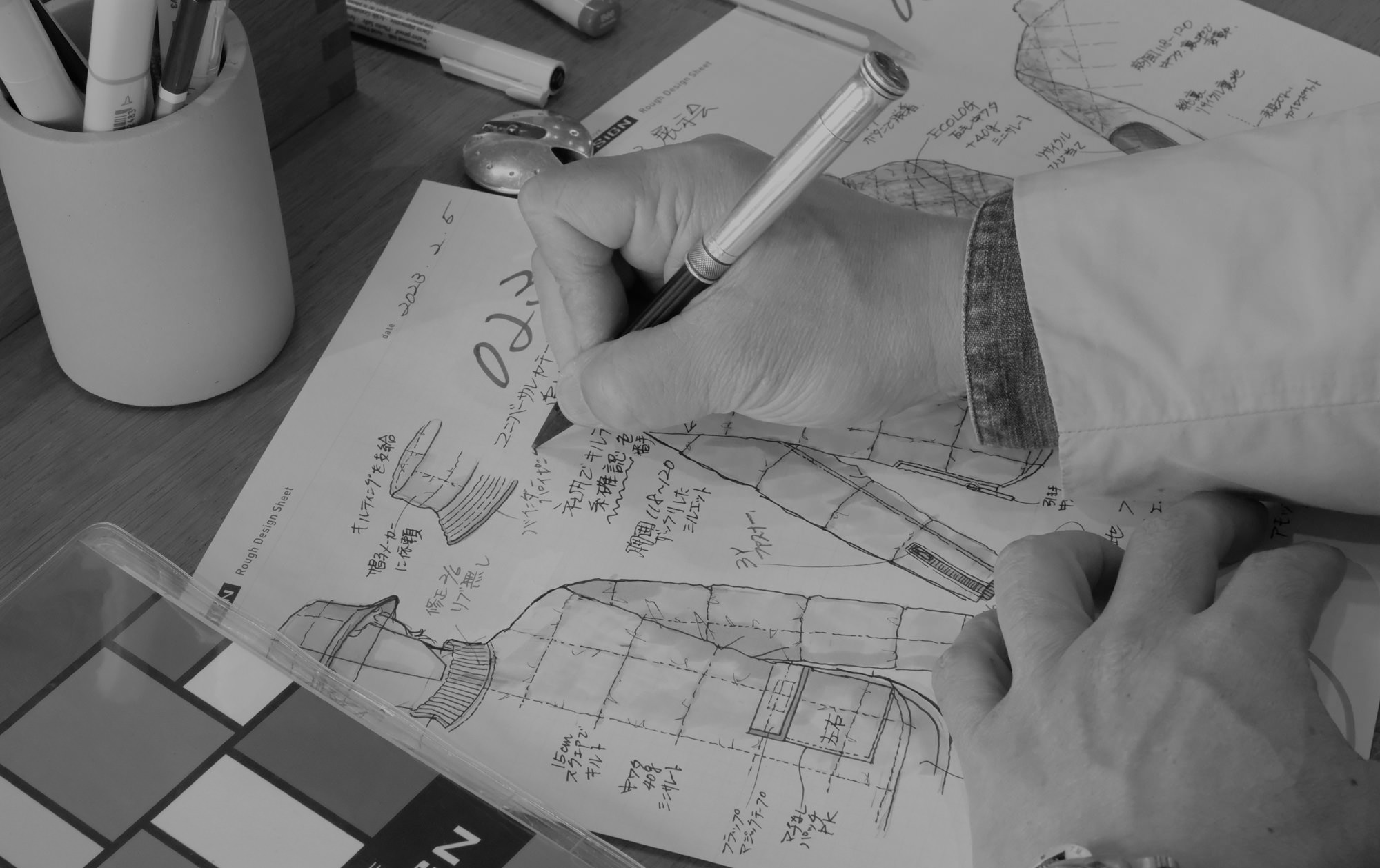 デザインをプレゼンテーションするだけではなく、パターン(型紙)・サンプル縫製・サイズグレーディング・マーキング・仕様書に至るまでを一気通貫で可能とする、技術力の高いクリエイティブ集団です。